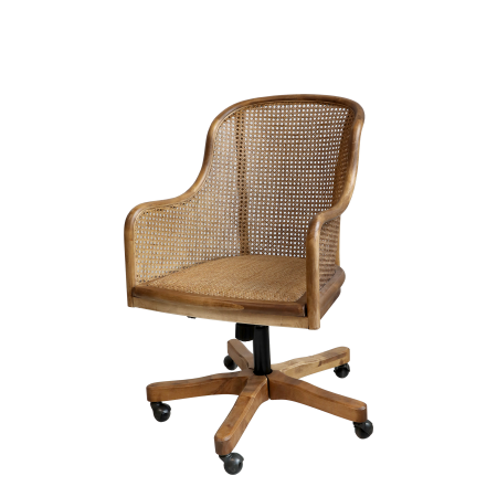 Lad dit kontor få et strejf af fransk charme med denne smukke kontorstol i klassisk design. Med sit sæde og ryglæn i fransk flet kombinerer skrivebordsstolen æstetik og komfort på fornem vis. Den varme træramme og de elegante, antikke jernhjul fuldender det autentiske vintage-look, der passer perfekt ind i både moderne og klassiske indretninger.