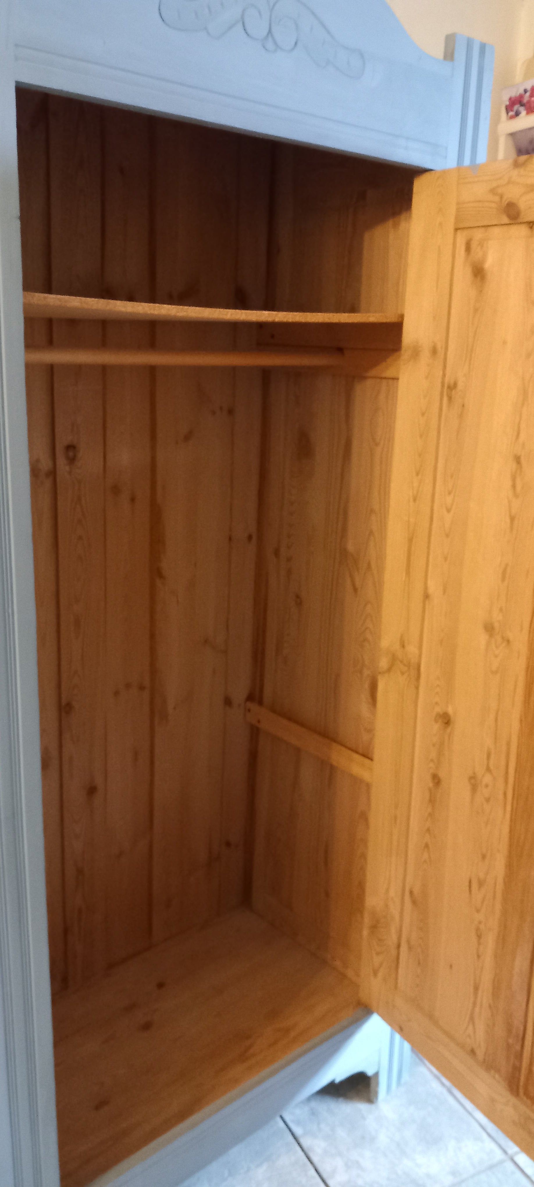 Karlekammerskab, med bøjlestang og 1 hylde i toppen.