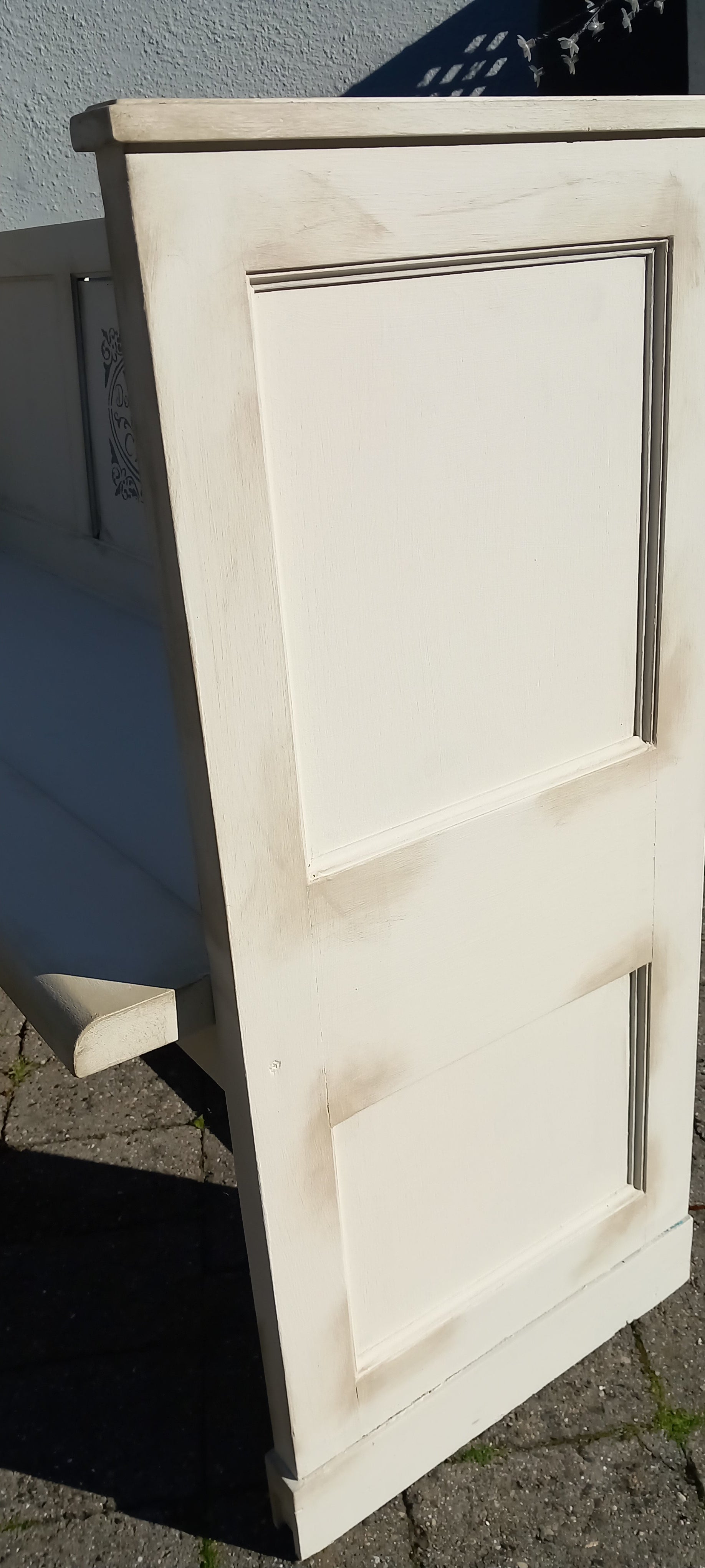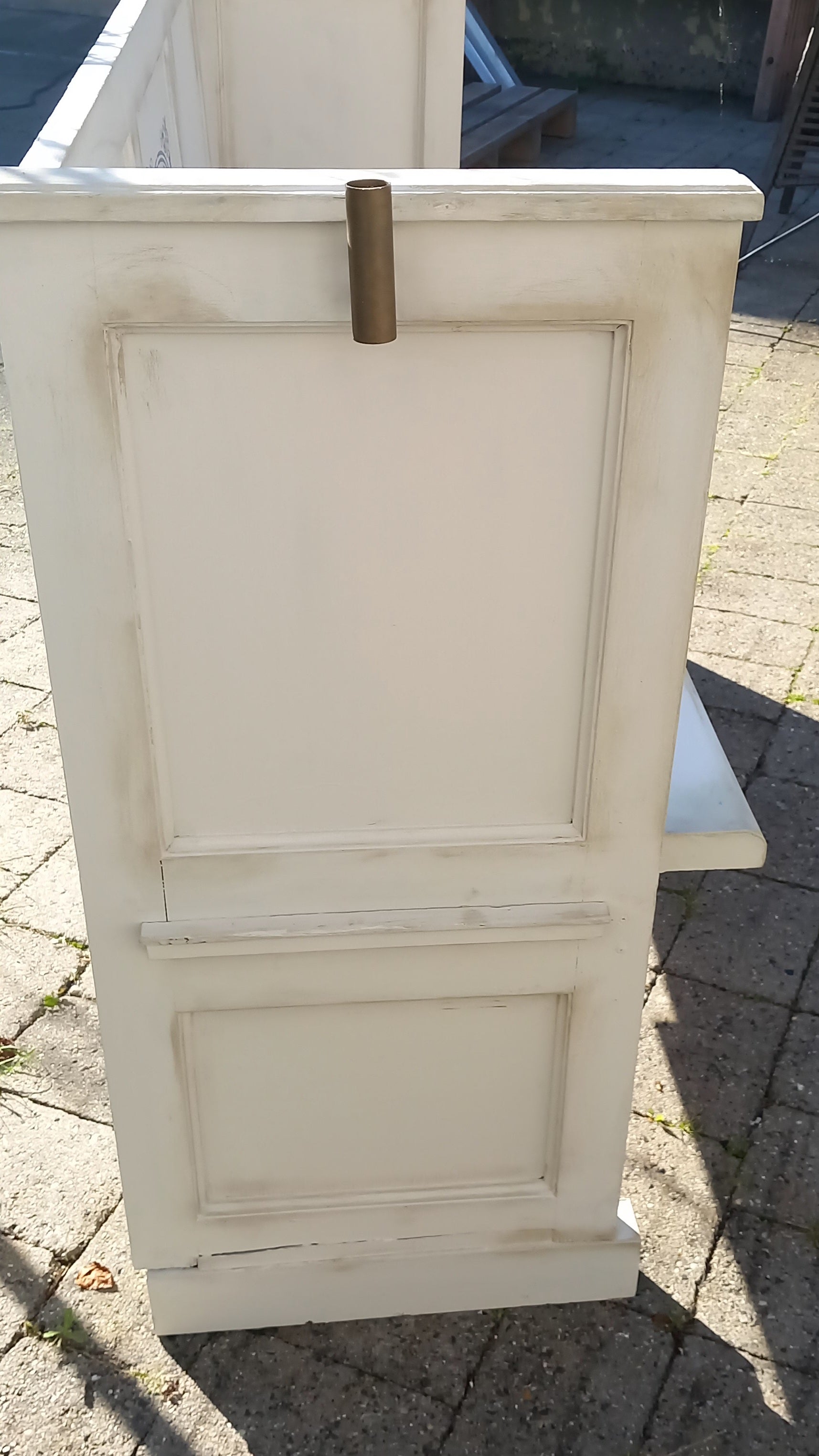 Gl kirkebænk, med lysholder i messing, og ekstra sæde der kan trækkes ud. Den har flere lag gl maling,som kan ses nogle steder. Sæder kan være lidt svær at trække ud, der kan dog skubbes på fra under sædet.