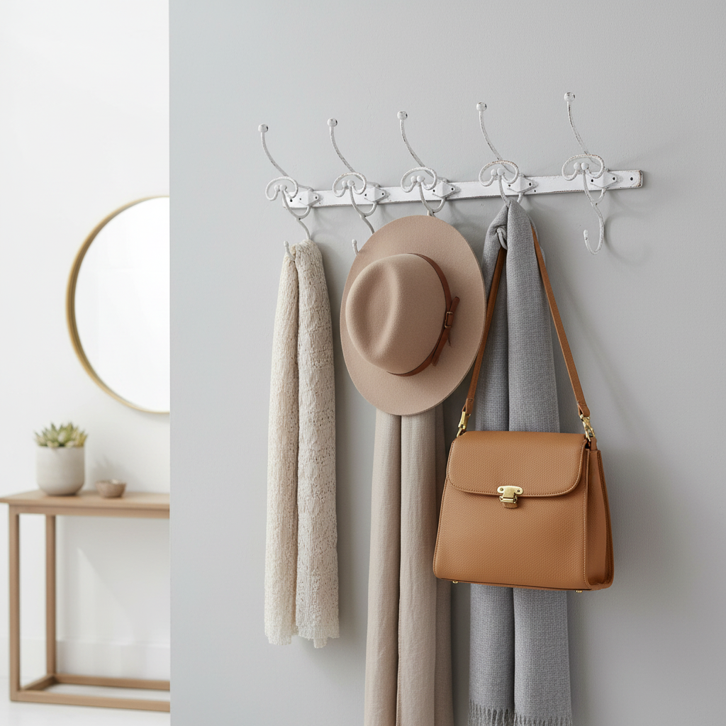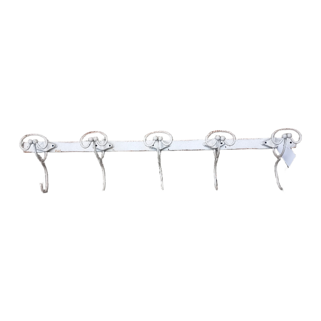 Cremefarvet metal knagerække med 5 dobbelt knage.