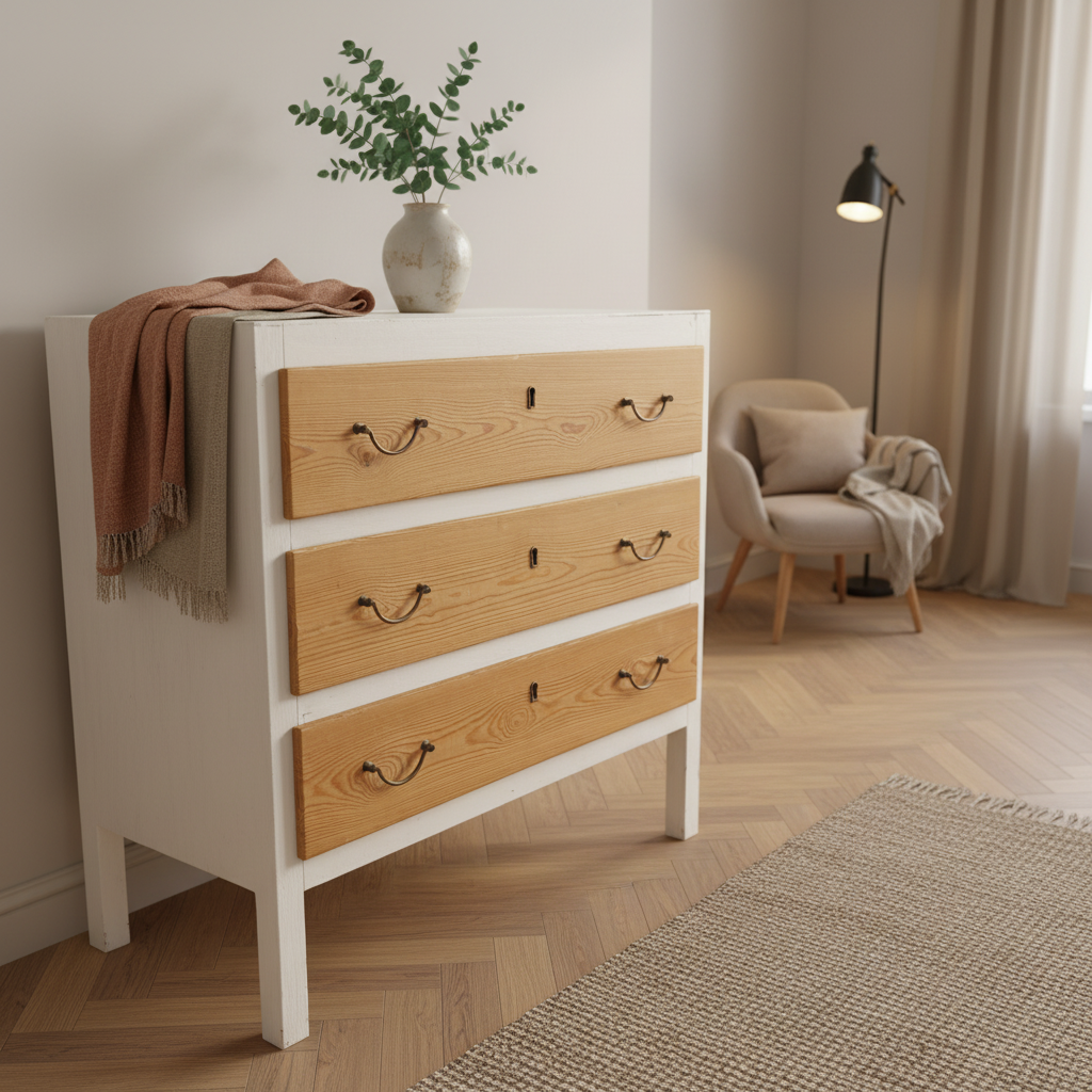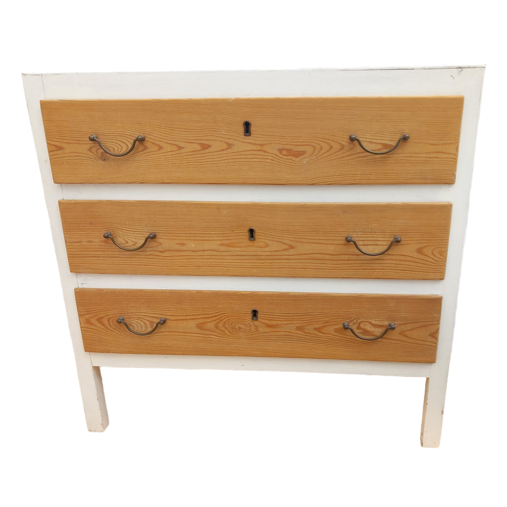 Kommode, gl hvid bemaling, står med rå skuffer.