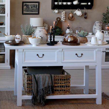 Marseille Anretterbord fra Chic Antique i hvidlakeret udgave, er et stilrent og alsidigt møbel, der tilfører en moderne elegance til hjemmet. Bordet er fremstillet i massivt poppeltræ med en ren hvidlakeret overflade, som skaber et friskt og tidløst udtryk. Med to rummelige skuffer er der gode opbevaringsmuligheder til køkkengrej, service eller andre småting, hvilket kombinerer funktionalitet med æstetik.