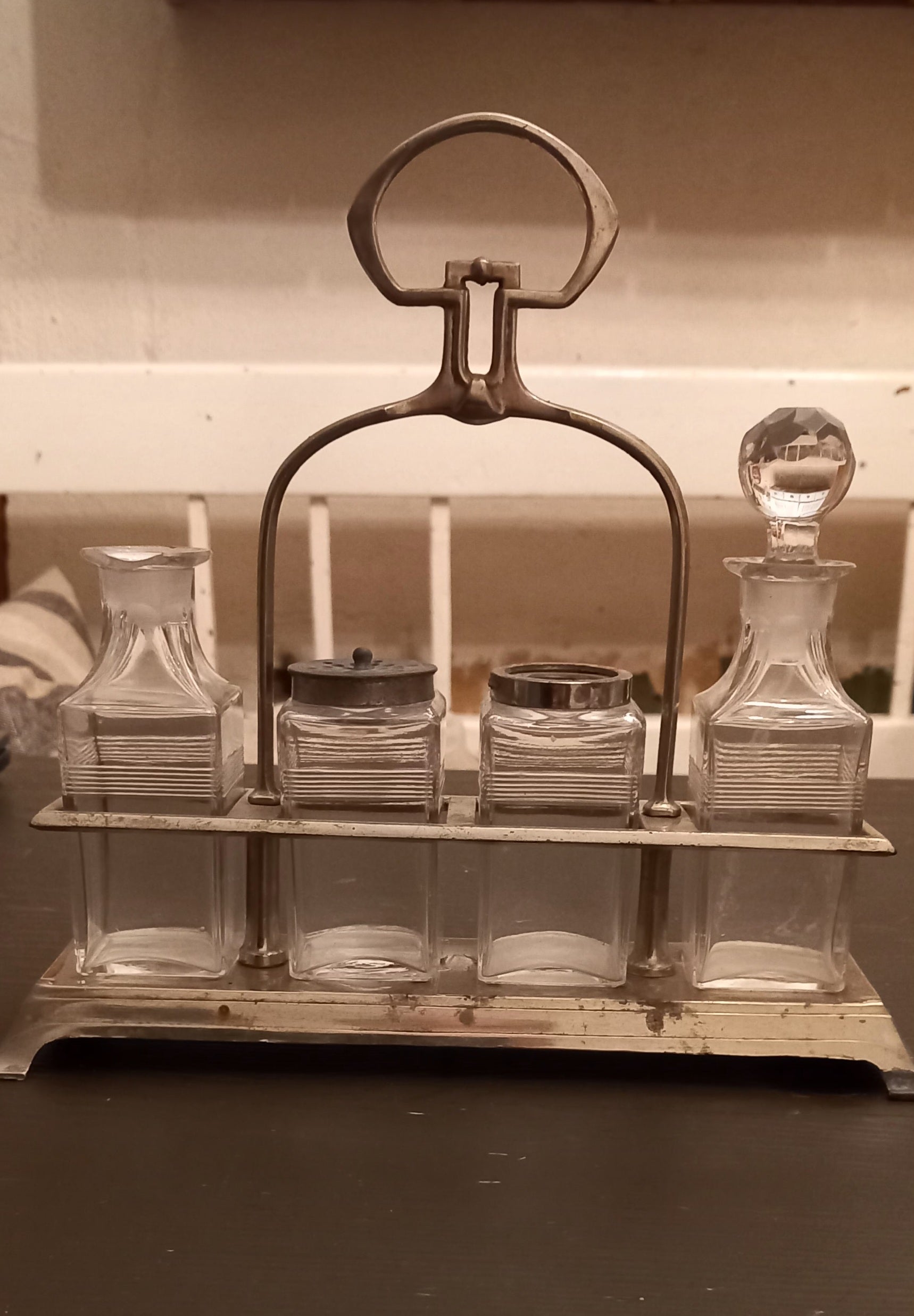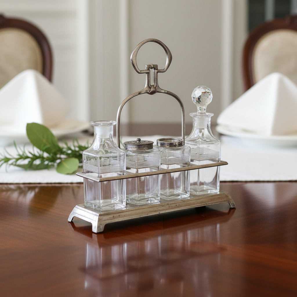 Forsølvet plat de menage (olie- og eddikesæt) med fire glasbeholdere. Sættet bruges til at servere krydderier og tilbehør som olie, eddike, sennep og salt eller peber. Lavet i sølvplet.