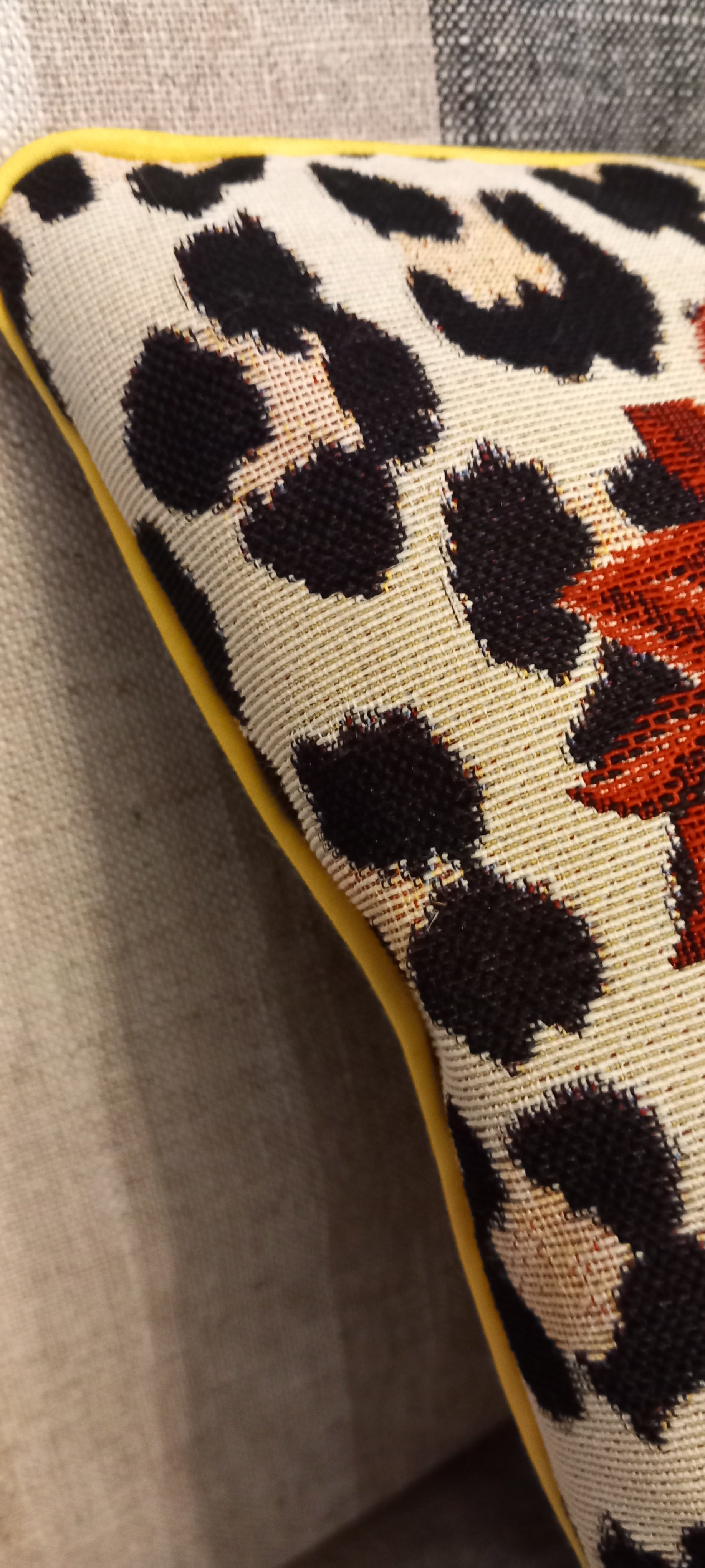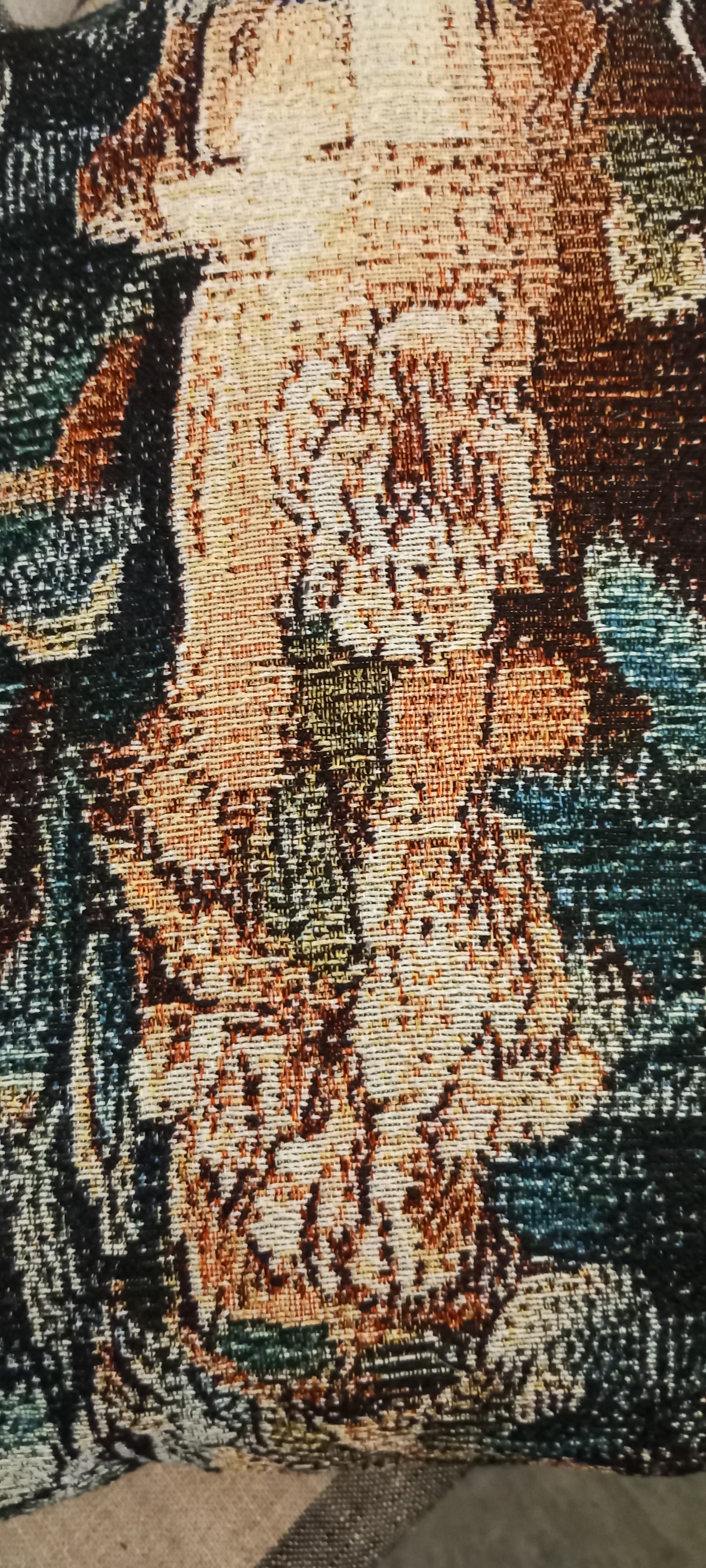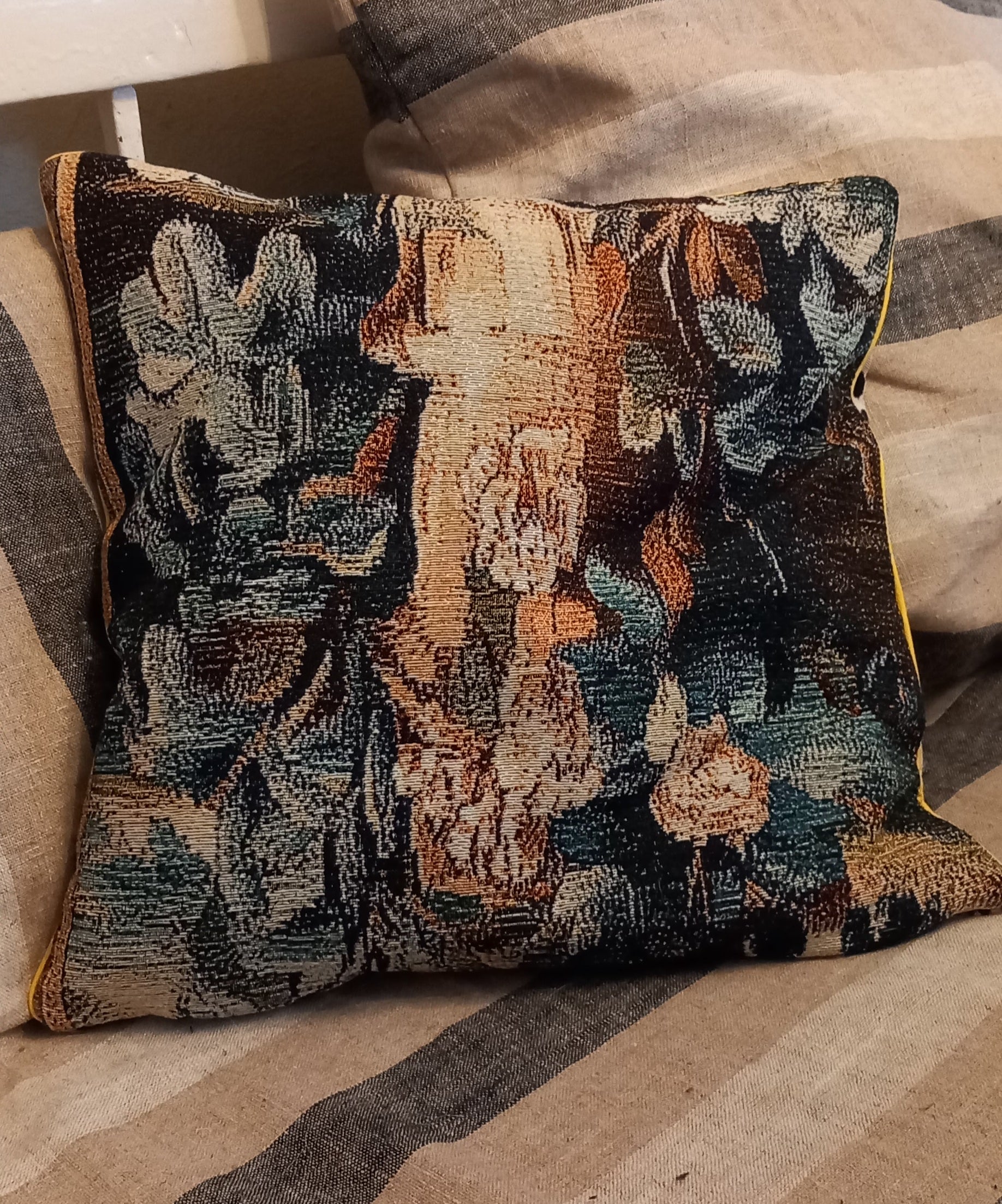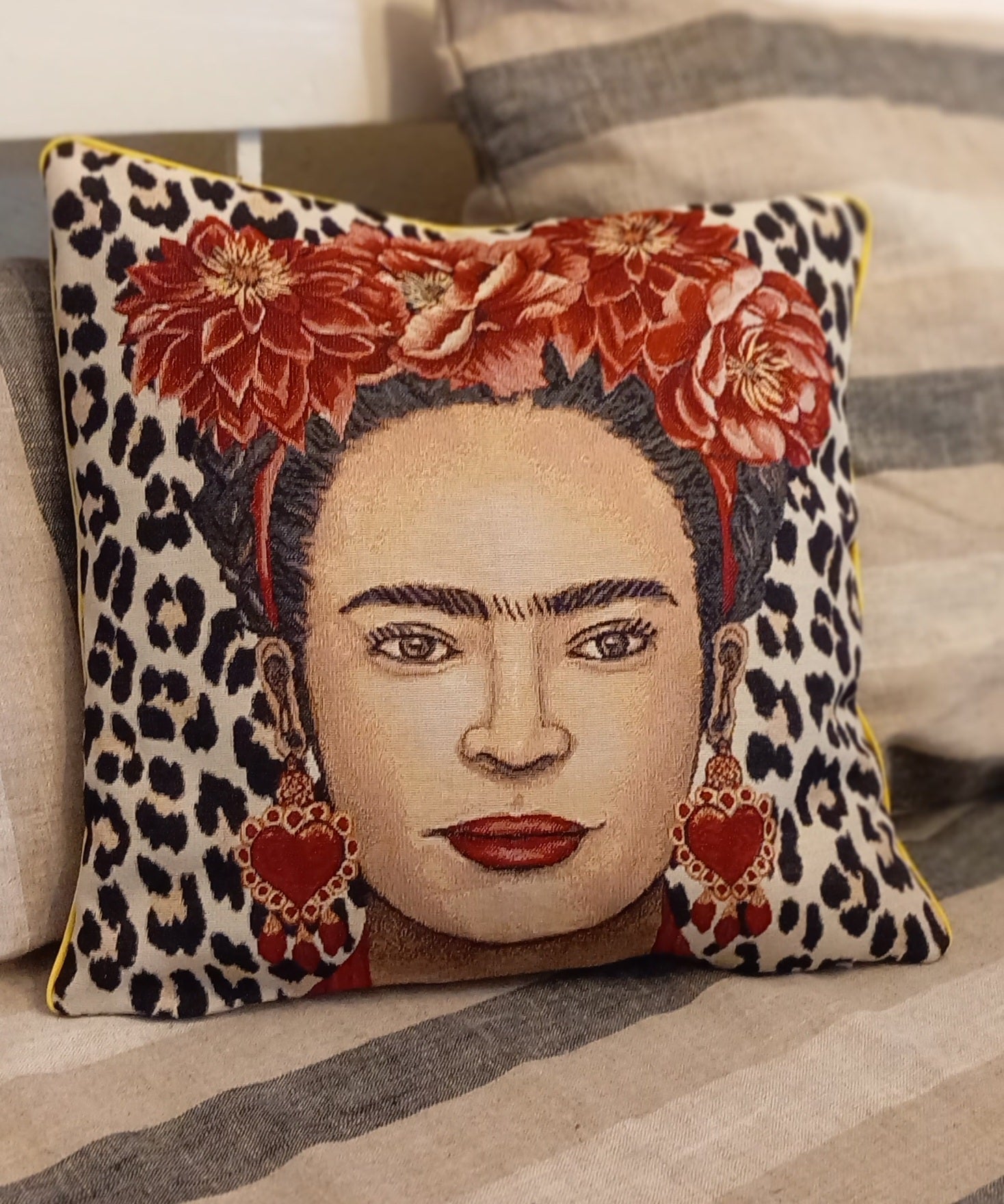 Pude, hvor du får 2 i 1, den er vendbar. Vaskbartbetræk. Gul piplinge kant. Frida Kahlo på den ene side, og det smukkeste gobelin stof på den anden side.