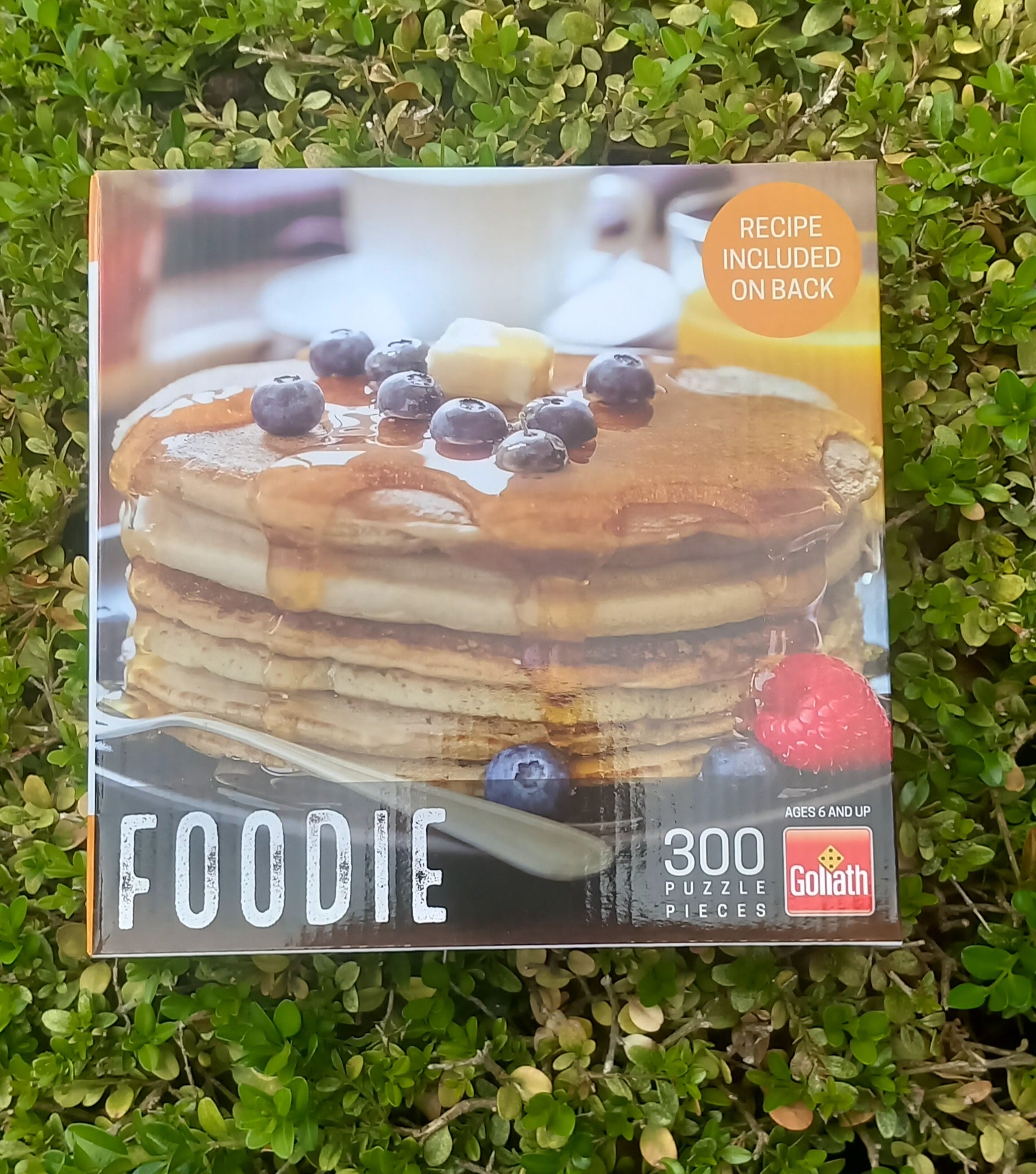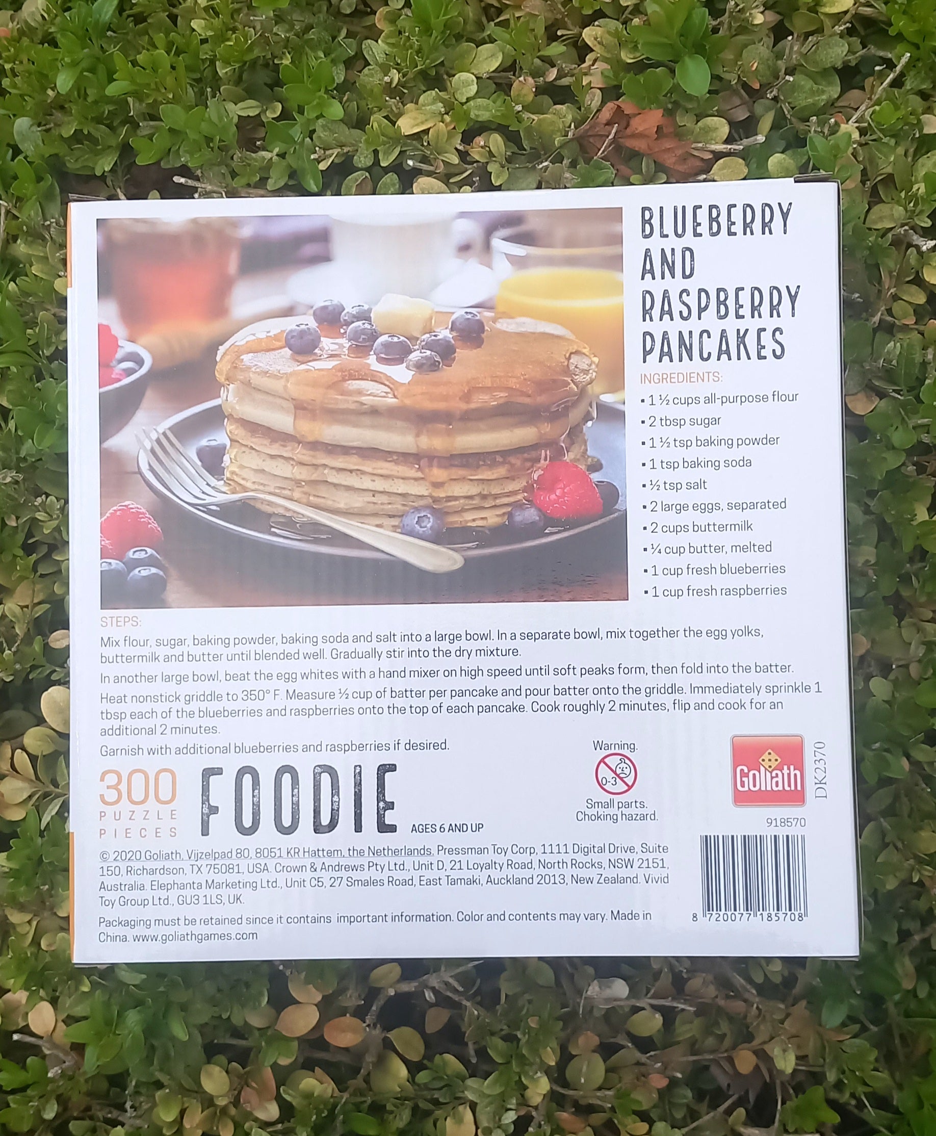 Fint puslespil med 300 brikker, på bagsiden af æsken findes en opskrift til at lave pandekagerne på billedet.