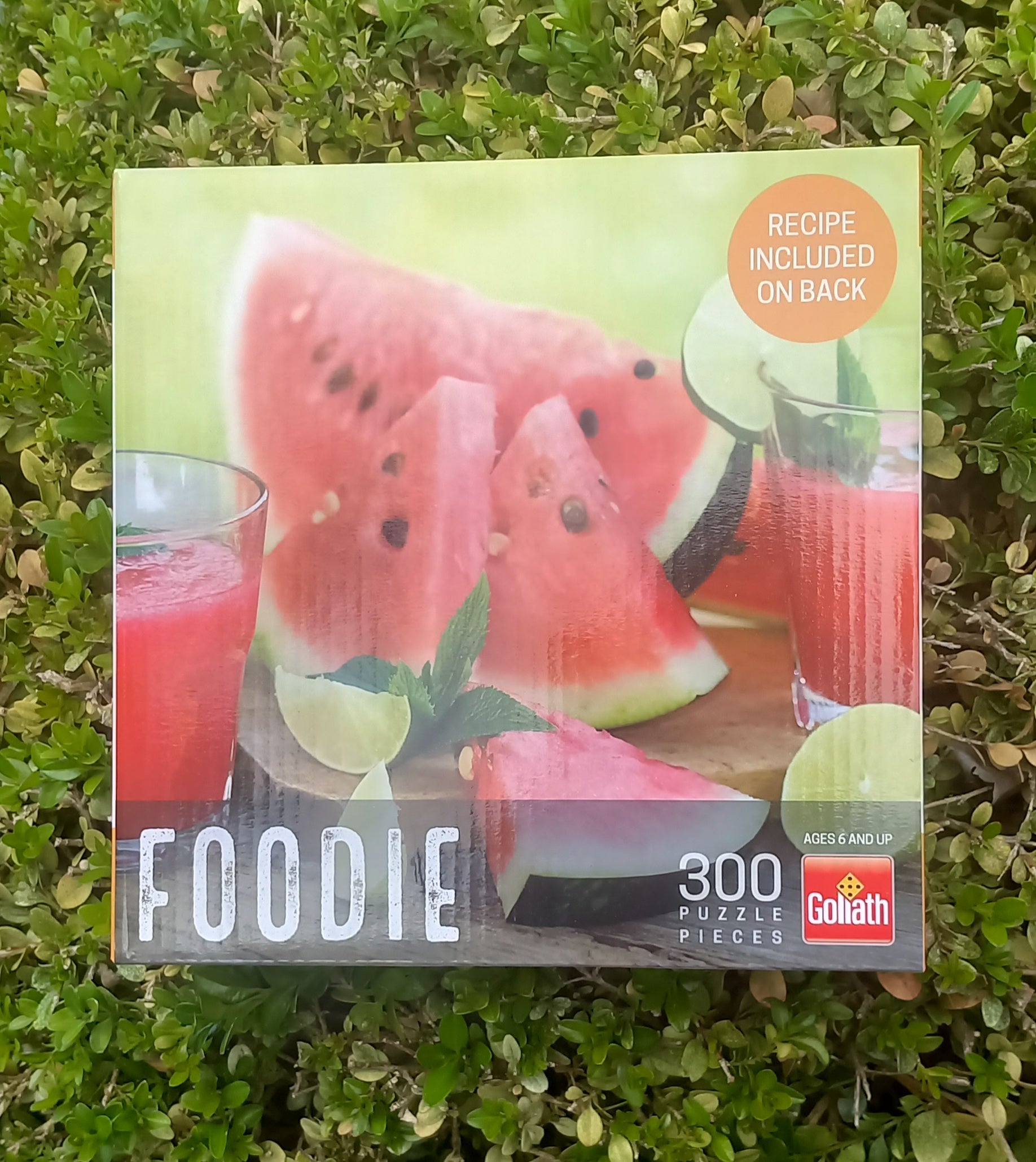 Fint puslespil med 300 brikker, på bagsiden af æsken findes en opskrift til at lave vandmelon smooties på billedet.