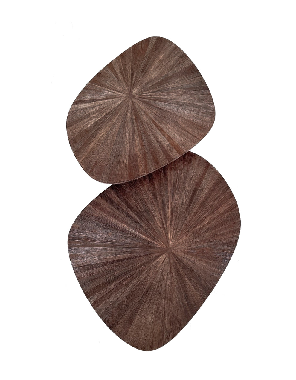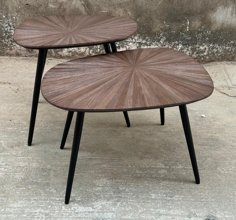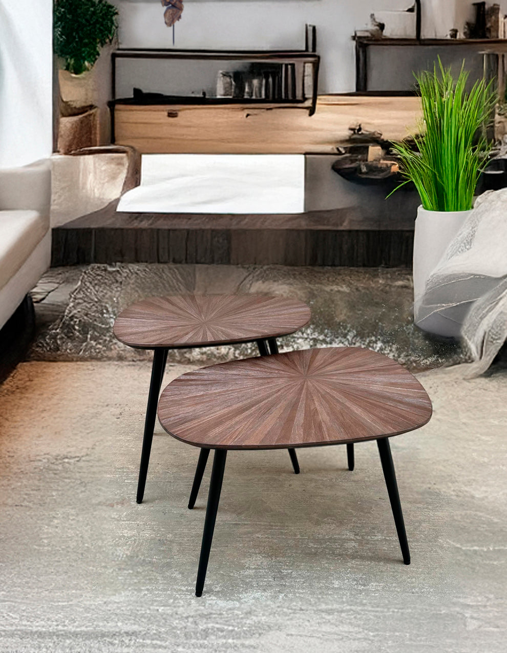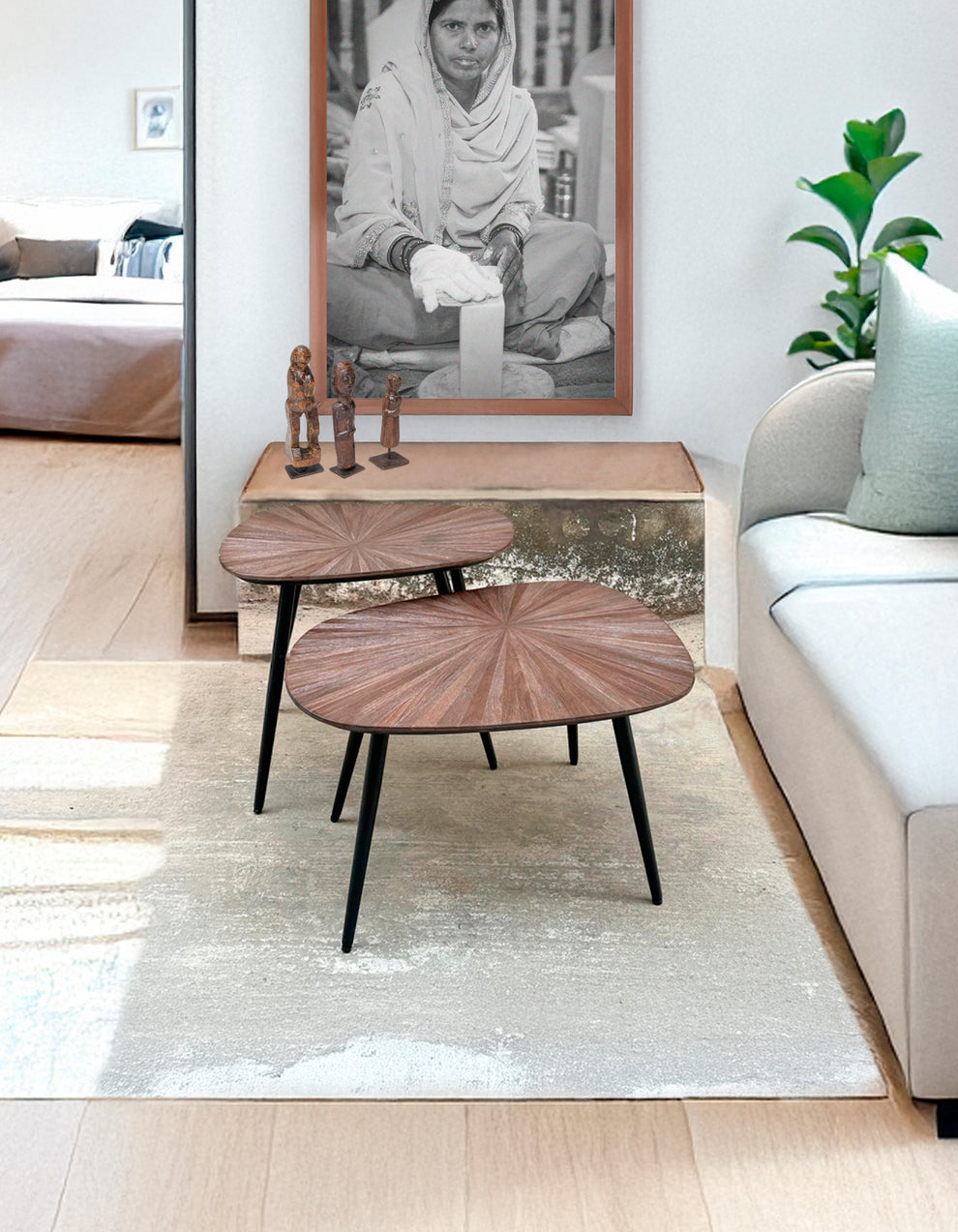 Dette unikke sæt består af to sofaborde i flot og tidsløst design i vores nye mørkebrune finish. Det er fremstillet af genanvendt teaktræ med en helt naturlig patina, som ældet træ har fået over tid. Teaktræet er monteret i stave på MDF plader, som giver et flot og unikt mønster i bordpladerne. Designet er alsidigt, da bordene kan bruges hver for sig eller sammen. Et bord er lidt lavere end det andet, hvilket skaber en dynamisk og flot opstilling, når de placeres sammen. Disse sofaborde er perfekte til at tilføre stil og varme til dit rum.