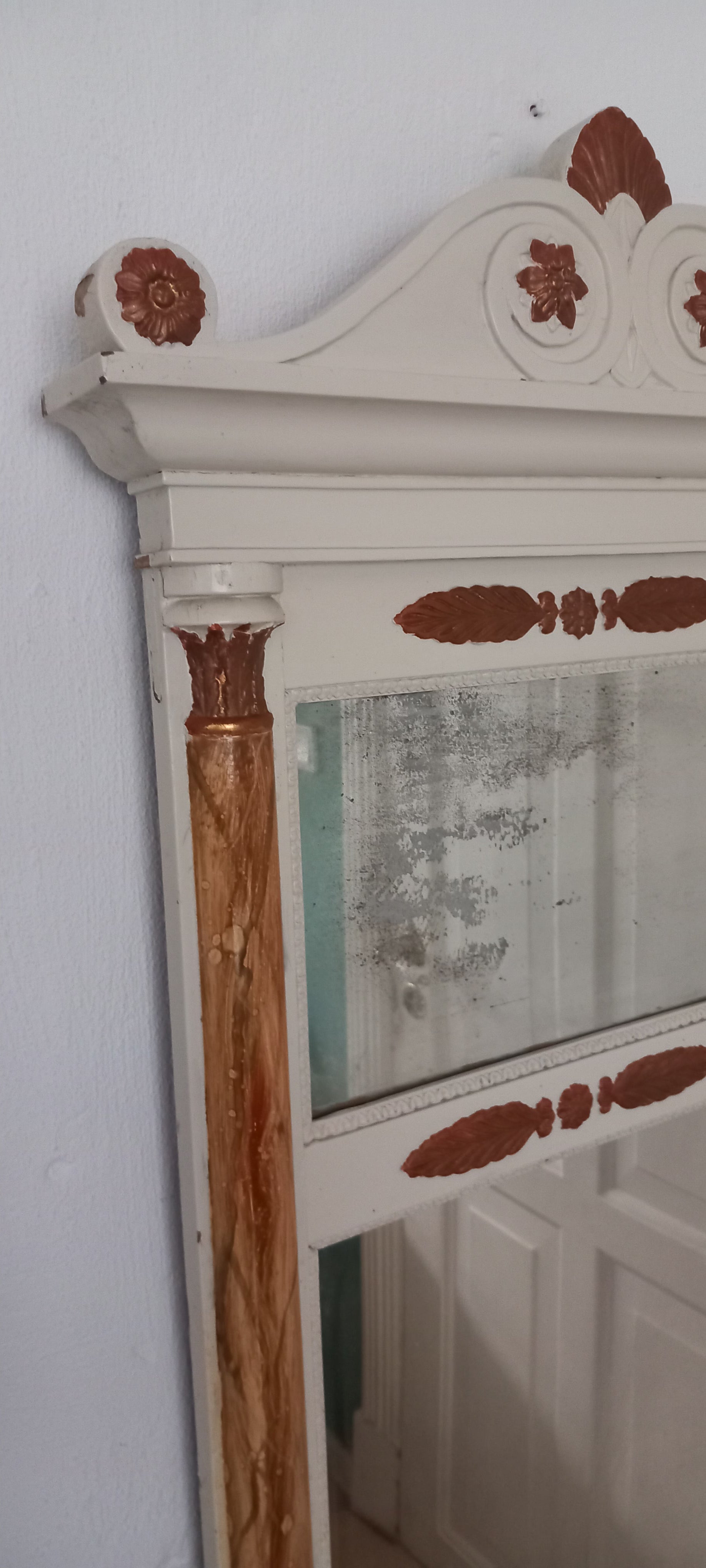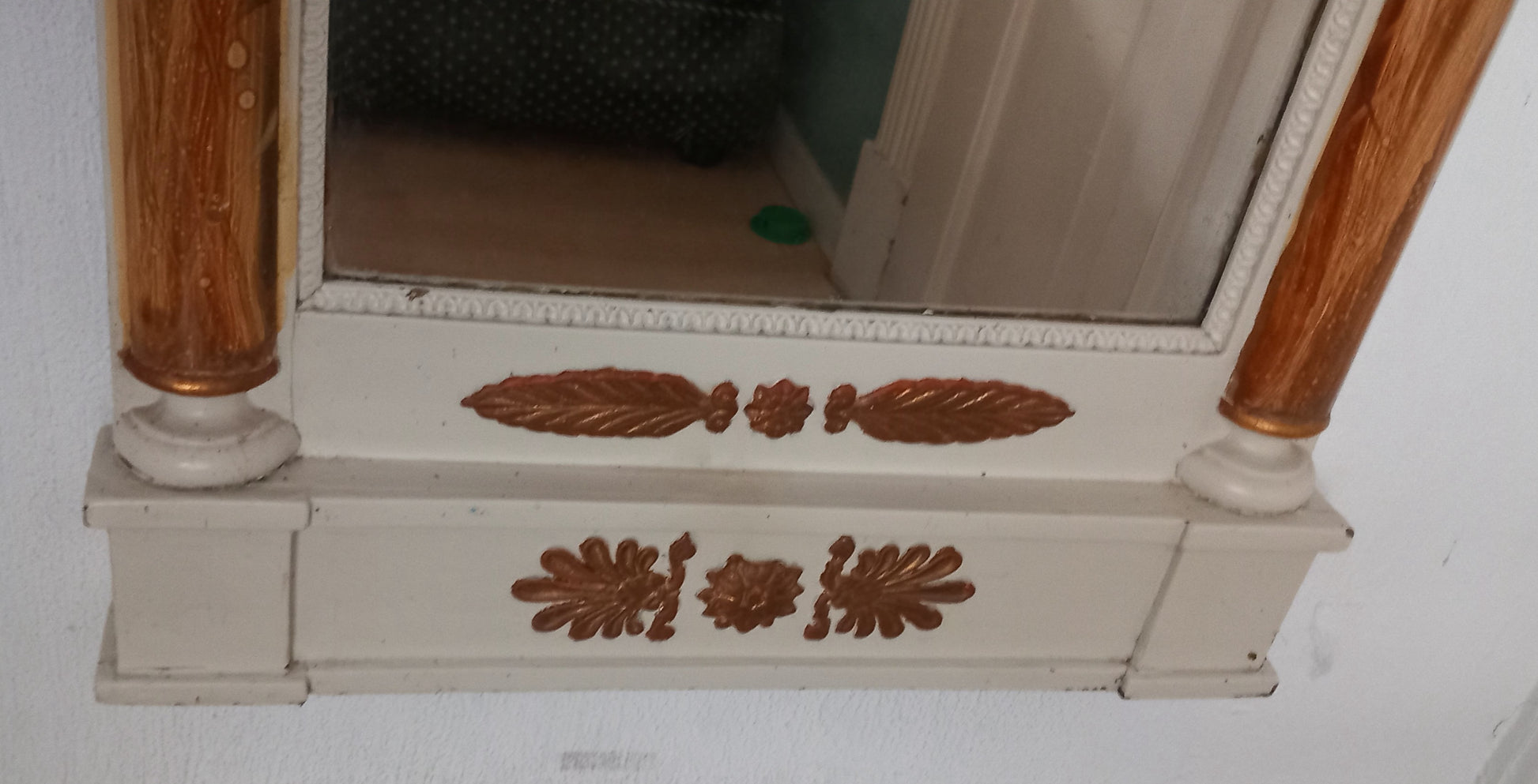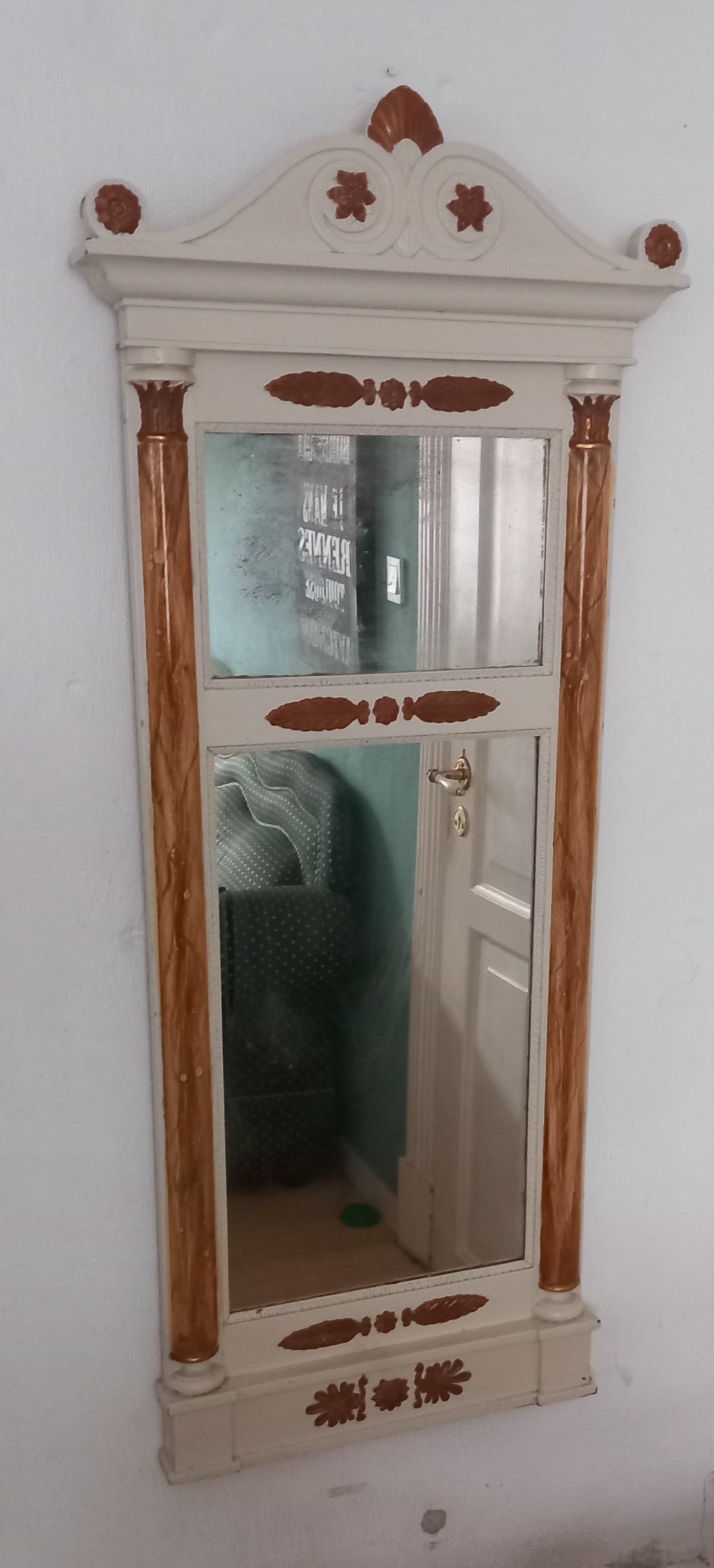 Smukt gl spejl. crmefarvet med maling der ligner marmor. Spejlet bærer præg af spejlpest.