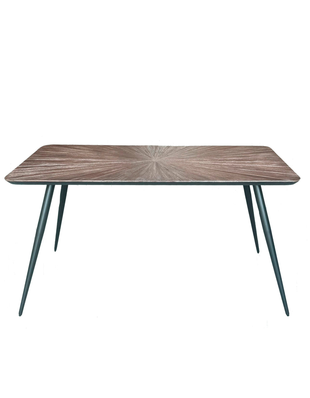 Dette smukke spisebord har vores nye finish og er omhyggeligt fremstillet af genanvendt teaktræ. Teaktræet er monteret i stave på MDF plader, som giver et flot og unikt mønster i bordpladen. Designet balancerer en let og tidløs æstetik med den rustikke charme fra det ældede træ, som gennem tiden har udviklet en unik patina. Resultatet er et møbel, der udstråler karakter og elegance og tilfører varme og stil til din spisestue.