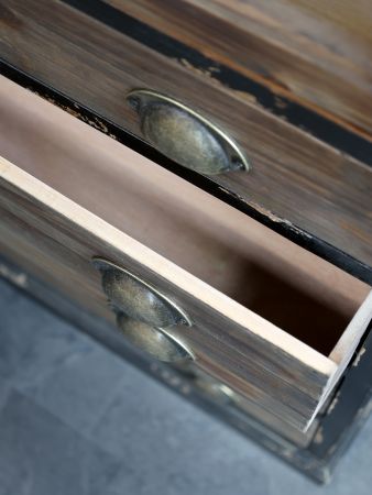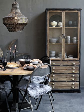Kontrasten mellem rammen i antique black, og glaslågerne, skuffer og skabets inderside i træ med et naturligt og patineret look gør, at dette smukke skab virkleig skiller sig ud.